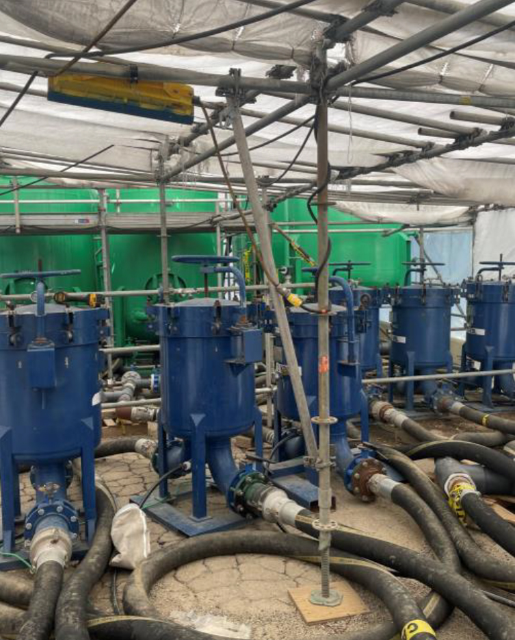 Two individual water treatment systems operate concurrently on-site, treating up to 4,500 m³ of mercury-contaminated water daily. Each system consists of four large carbon vessels, a high-pressure diesel pump, four sand pod filters, and three bag filter chambers. The systems run 24/7, with a single water treatment technician overseeing both at any given time. Carbon changeouts are required on a frequent basis and are carried out onsite by the KBL personnel.